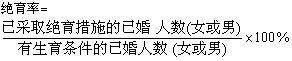 一定时期内(通常为一年)采取绝育措施的已婚人数与有生育条件的已婚人数之比。按性别分别计算。计算公式为: