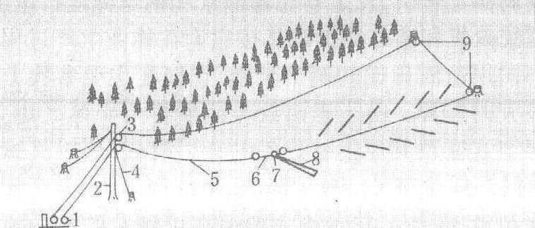 绞盘机集材示意图 见绞盘机。 绞盘机集材donkey loggin g又称钢索集材。以固定在适当位置的绞盘机为动力,牵引钢索拖曳木材,从伐木地点汇集到装车场或山上楞场的作业。它既可以应用在平坦和丘陵林区,也可以应用在坡度较大的山地林区,特别在低湿和沼泽的林地内,夏季采用绞盘机集材比较适宜。绞盘机全拖式集材要求地形地表起伏变化不大,且无岩石裸露的林地。绞盘机半悬式集材,由于所集木材的前端吊起拖曳,遇到正面阻力可能性较少,所以对地形地表变化情况要求不严。 |