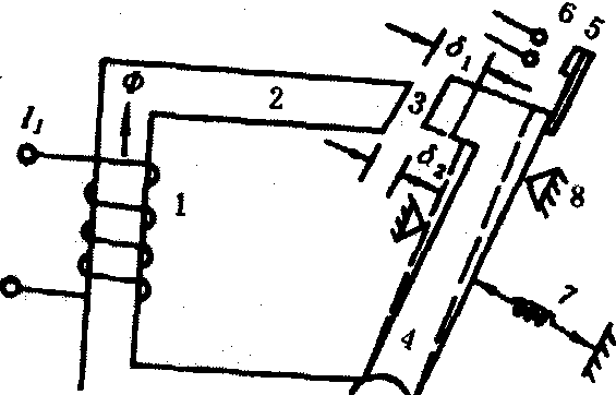 图1 电磁型电流(电压)继电器原理结构 1.绕组; 2.铁芯; 3.气隙; 4.舌片; 5.动触点; 6.静触点; 7.弹簧; 8.限止支点