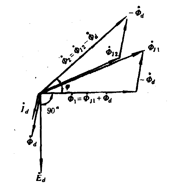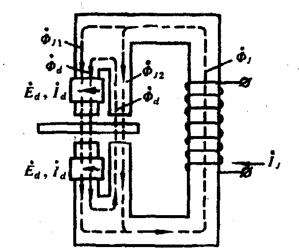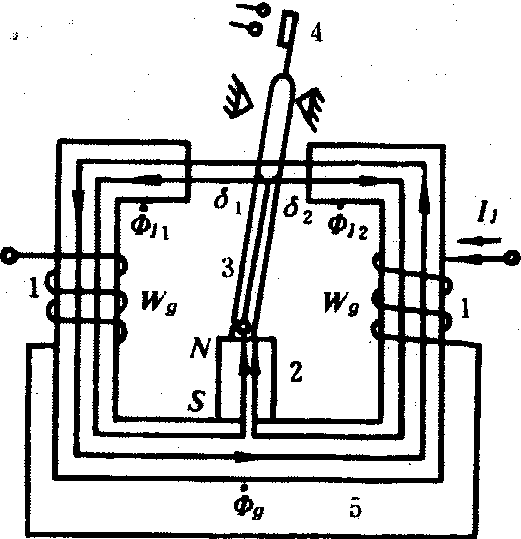 (b)循环电流式 图4 整流型功率方向继电器幅值比较回路 整流型功率方向继电器的执行元件,用极化继电器(图5)或晶体管零指示器。永久磁铁产生的磁通,由N极分成两部分Φj1、Φj2,分别经气隙δ1及δ2形成回路。正常时,δ1>δ2,Φj2>Φj1,舌片在Φj2-Φj1形成的磁力作用下,被吸向右侧,当工作线圈1通入电流IJ(正方向如图5),在磁隙中产生磁通Φg。于是,气隙δ1中的磁通为ΦJ1=Φg+ΦJ1,而气隙δ2中的磁通为Φ2=Φg-Φj2。当工作线圈的电流为继电器的启动电流时,Φ1>Φ2,舌片被磁极吸向左侧,触点闭合。继电器启动后,工作电流减小,当Φ2>Φ1时,舌片被吸向右侧,继电器返回。当工作线圈通入反方向的电流时,继电器不动作。
