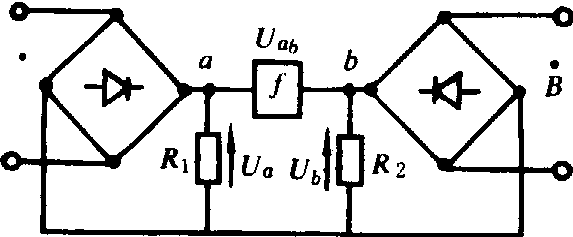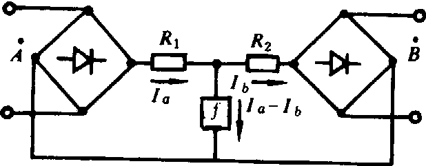 (c)d-2点短路相量图 图3 功率方向继电器输入量的方向和相位 整流型功率方向继电器将相位比较转变为幅值比较。它通过电压形成回路,以电压变换器将UJ形成电压KU·UJ,以电抗互感器将IJ形成电压KI·IJ,于是KU·UJ=KI·IJ·ej。其中KU、KI为已知相量,J为UJ、IJ的夹角,并形成电压相量A=KU·UJ+KI·IJ和B=KU·UJ-KI·IJ。若幅值A>B,说明KU·UJ、KI·IJ两相量间的夹角为锐角。反之,其夹角为钝角。这样,相量A、B的幅值比较(幅值比较回路如图4),可以代替由电压变换器及电抗互感器所形成的两个电压相量的相位比较。均衡电压式的执行元件,反应A、B整流后a、b两点的电压差而动作;循环电流式的执行元件,反应A、B整流后的电流差而动作。