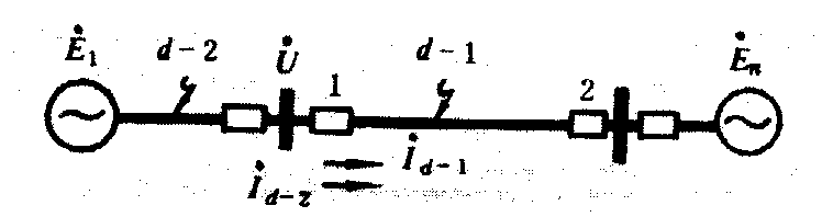 (b) 相量图 图2 感应型过电流继电器原理结构 功率方向继电器 是方向继电器的一种。是以电压为基准输入量及电流为另一输入量,和以两输入量相量间夹角为特性量的量度继电器。用于电力系统方向性电流继电保护装置,有感应型、晶体管型和整流型等几种,后者应用日益广泛。输入量的方向和相位如图3所示,图中1、2为功率方向继电器,它以母线电压为基准输入量,当电流从母线流向线路时,电流输入量的方向规定为正方向。功率方向继电器的动作方式有两种:❶电流输入量IJ与基准输入量UJ二相量间的夹角为锐角时,继电器动作;为钝角时不动作。动作方程为-90° ❷如反映相间短路,功率方向继电器所接入的电流IJ是故障电流,而接入电压UJ是其他两相的相间电压,继电器的动作方程为-90°-α