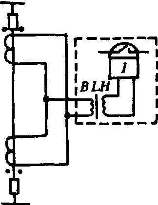 图5 极化继电器原理结构 1.工作线圈;2.永久磁铁;3.可动舌片;4.触点5.铁芯; δ1、δ2.气隙 差动继电器 反应被保护区内各侧电流相量差的量度继电器。反应被保护对象流入与流出电流相量差的为纵联差动继电器,用于较大容量的发电机、变压器和短距离送电线路的保护;反应并联支路同一端电流相量差的为横联差动继电器,用于发电机和平行线路的保护。差动继电器是输入量为电流相量的电流继电器,为了克服不平衡电流的影响,提高其灵敏度,它与普通电流继电器有所不同。在理想情况下,正常运行或保护区外短路时,流经纵联差动继电器的电流应为零,继电器不动作;实际上此电流并不为零,这个不为零的电流称为不平衡电流。不平衡电流有:❶稳态情况下,由于两个电流互感器的励磁电流差形成的不平衡电流; ❷暂态过程中的不平衡电流,当保护区外发生短路时,因短路电流含有非周期分量,使电流互感器的励磁电流除稳态电流外,还含有大量的强制非周期分量和自由非周期分量,于是,在差动回路中形成很大的不平衡电流,且含有非周期分量; ❸变压器励磁涌流产生的不平衡电流。当变压器空载合闸时,若在电压为零的瞬间接通电路,因出现非周期分量的磁通,将引起变压器铁芯的严重饱和,励磁电流将剧烈增大,此电流称为变压器的励磁涌流,数值可达额定电流的6~8倍。这个电流只发生在变压器的一侧,因而形成不平衡电流。此外,电流互感器的计算变比与实际变比不同、两侧电流互感器型号不同、变压器原副边的连接组不同、调压分接头的变化等, 也都会产生不平衡电流。减小不平衡电流的主要方法: ❶在差动回路中接入具有快速饱和特性的中间变流器(BLH)(图6),当输入电流具有非周期分量时,因电流使铁芯饱和,电流变化一周期,磁感应强度变化很小,使变流器二次侧的感应电流大为减小,限制了含有非周期分量的不平衡电流的影响。 ❷为了进一步减小非周期分量不平衡电流的影响,采用带短路线圈的速饱和变流器,即加强型速饱和变流器。当原边绕组有周期分量电流通过时,短路线圈中的感应电势起去磁作用,相当于减少了原边绕组的匝数。当非周期分量电流通过原边绕组时,短路线圈不产生感应电势,即不起去磁作用。非周期分量电流产生的磁势仍使铁芯饱和,从而加强了对非周期分量不平衡电流的限制。 ❸采用具有制动特性的差动继电器,能可靠地躲开外部故障时引起的不平衡电流。此外,还可采用具有二次谐波制动的差动继电器,可有效地防止励磁涌流的影响。