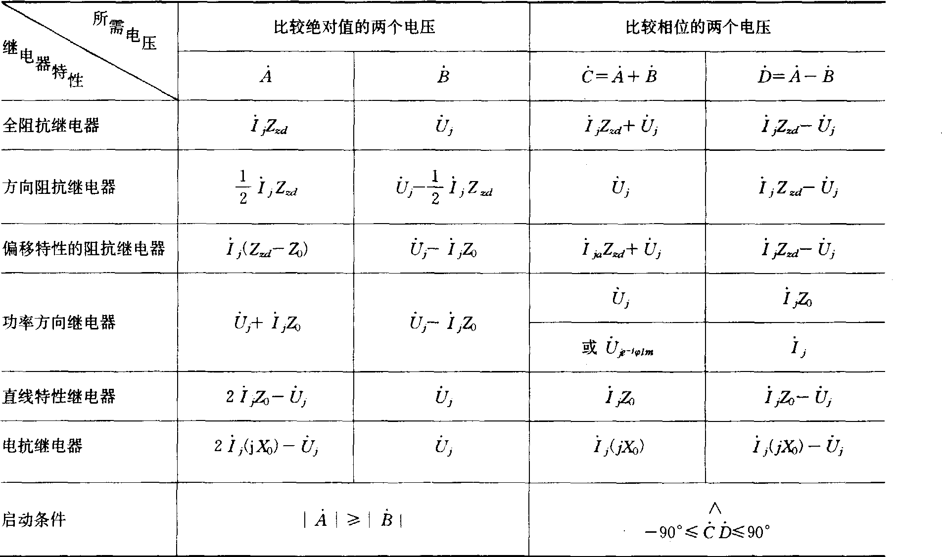 (a) 线路接入速饱和变流器 图6 在差动回路中接入速饱和中间变流器 阻抗继电器 具有电流和电压两个输入量,特性量为阻抗的量度继电器。它测量短路点到保护安装地点之间的阻抗(即距离),并与整定阻抗值相比较,决定继电器是否动作。分为单相式和多相式两种:❶单相式只输入一个电压UJ和一个电流IJ,ZJ= UJ/IJ,称为继电器的测量阻抗。它与系统一次侧的测量阻抗有下列关系:ZJ=Zd·(ni/nj)。式中ni/nj为电流互感器、电压互感器的变比。阻抗继电器的动作特性通常扩大为复数平面的一个圆。测量阻抗的末端落在圆内,继电器动作;落在圆外不动作;落在圆上刚好动作。按动作特性不同分为全阻抗继电器、方向阻抗继电器、偏移特性阻抗继电器、功率方向阻抗继电器、直线特性阻抗继电器等。继电器的动作都可以幅值比较或相位比较方式实现。阻抗继电器的构成方式及结果见表。 ❷多相式阻抗继电器输入几个相的电压,优点是可以反应不同相别组合的相间或接地短路,其动作特性的分析比较复杂。阻抗继电器的构成方式及结果如表所示。 阻抗继电器的构成方式及结果