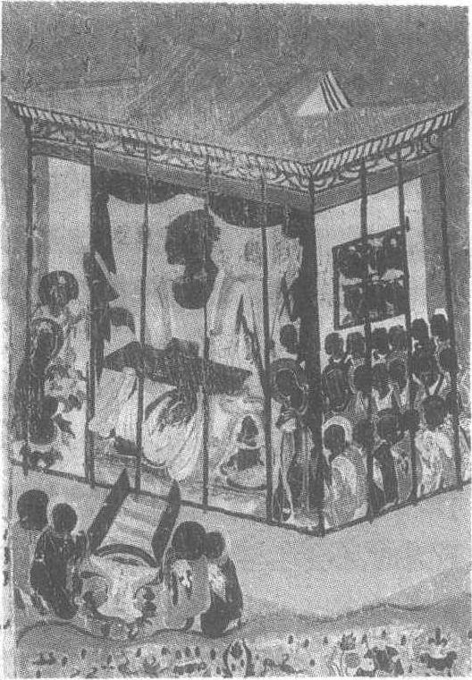 | 释义 | 维摩诘经变图壁画隋。纵130厘米,横100厘米。甘肃省敦煌县莫高窟第420窟西壁龛南北两侧壁画。维摩诘是神通广大的大乘居士,经常装病吸引有智之士辩论,其中最著名的是佛派智慧第一的菩萨文殊师利借问“疾”,二人反复论说佛法。这一佛教题材在寺庙雕塑和壁画中多有表现。此窟中维摩诘和文殊师利分绘于壁龛两侧,南北相对,二人分坐于歇山顶殿堂之内。维摩诘手持麈尾,凭几而坐,侃侃而谈,流露出神采焕发的气质。下部是一排排洗耳恭听的僧众。文殊坐于较高的须弥座上,挥动右手,似在辩论,情绪流露激动。图中殿堂虽占据主要画面,但还衬有清秀的竹林,荷塘、莲花、鸳鸯等颇具乡村气息的景色。上空还有飞天捧花漫撒,画风颇为细腻。