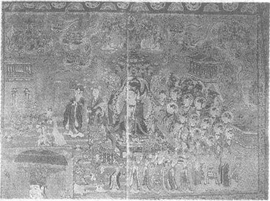 维摩诘经变图壁画五代。纵281厘米,横446厘米。甘肃省敦煌县莫高窟第98窟东壁南侧壁画。图南侧绘文殊菩萨,北侧绘维摩诘居士。文殊师利端坐于莲座之上,双手合十,庄重沉稳。四周有赶来赴会的帝王,正在肃立聆听这场激烈的辩论。群臣恭立于后,气派不同凡响。图中的维摩诘为一老年形象,执扇凭几坐于帐中。各国王赶来听法,服饰各异,系来自南方及西域诸国。文殊及维摩诘身后皆有听法的菩萨、天王、帝释等。四周画佛国品、香积品等诸品内容。整个画面构图工整,色彩鲜艳,具有较强的装饰性,是五代时期的上乘之作。