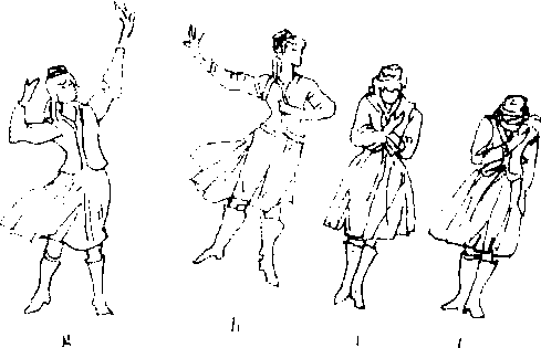 ❹三步一抬:右脚为例,面向8点,右脚起半拍一步共走三步,第四步左脚掌向后挠地同时抬下腿,身体转向2点,然后左脚起步向2点方向走,动作相同,左右相反。要求走得平稳,显得高雅。可直线做,也可做抬步转身。