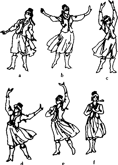 基本手型是近似兰花掌,指根放松,中指向掌心拇指相近。提裙位:(单、双手两种) (图a)山膀立腕位(图b)。双托位(图c)顺风旗位(图d)托按掌位(图e)双按掌位(图f)。托帽位(图g)。山膀按掌位(图h)。敬礼位(图i、j)。