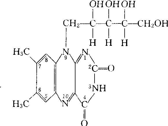 维生素B7vitamin B7见“生物素”。 维生素B2vitamin B2又称核黄素。B族维生素的一种。化学结构为6,7-二甲基-9-(D-1-核糖醇基)异咯嗪。橙黄色,水溶液有黄绿色荧光,对光、碱不稳定,酸性溶液中相当稳定,体内以黄素单核苷酸和黄素腺嘌呤二核苷酸两种形式存在,作一些氧化还原酶的辅基。在糖、脂、蛋白质和核酸代谢中起重要的作用。缺乏时,会妨碍细胞氧化作用,物质代谢发生障碍,出现精神萎靡、生长减退,以及各种黏膜和皮肤的炎症等。哺乳动物肠道和昆虫体内寄生的一些微生物能合成核黄素,从而可被动物吸收利用。肝、肾、口蘑、紫菜、河蟹、鳝鱼和桂圆等是其最好的来源。
