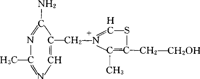 吡哆醇 维生素B1vitamin B1又称硫胺素。B族维生素的一种。化学结构式如下。3-(4-氨基-2-甲基嘧啶-5-亚甲基)- 5 -〔2-(羟乙基)-4-甲基〕噻唑。白色,极易溶于水,耐热,酸性溶液中稳定,中性或碱性溶液中易破坏。医药上常用的是其盐酸盐。体内以其焦磷酸酯(TPP)形式出现,对维持正常的糖、脂代谢具有重要作用。缺乏时,会出现疲倦、情绪不稳,进而神智混乱、心跳不规则,严重的出现神经炎、心肌衰弱等症状。蔬菜、乳类、肉类和鱼卵中均有,谷类、豆类的种皮和酵母中含量尤为丰富。