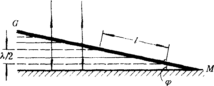 | 释义 | 维纳驻波实验weina zhubo shiyan最早验证光驻波存在的实验。1890年维纳所做。实验装置如图所示,M为镀有高反射率银膜的干面镜,G为薄的透明玻璃片,M和G的夹角ᵠ很小。玻璃片上涂着一层感光乳胶(当时用火棉胶制成的感光乳胶),厚度不到波长的1/20。一束单色平行光垂直于平面镜入射,入射波和反射波为频率相等、振动方向相同的两束波,但传播方向相反,叠加后产生驻波。在波腹处乳胶感光,显影后变黑;而在波节处,乳胶不感光,显影后呈白色,在乳胶膜上可看到黑白相间的条纹。两个相邻波腹间的距离等于λ/2(λ为光的波长),在乳胶膜上两黑条纹的间距为