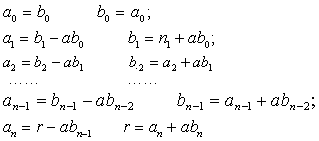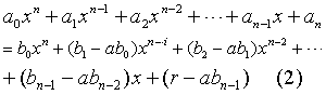 ![]() 从上面右边得出的一列等式可以看到,不完全商(x)的各项系数b0,b1,b2,…,bn-1和余数r,可以从被除式f(x)的各项系数a0,a1,a2,…,an和除式x-a中的a顺次递推出来. 为了方便,上面的计算可以列式来进行