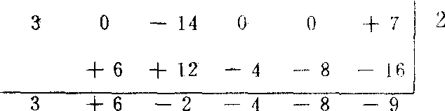 例如,求f(x)=3x5-14x3+7除以x-2所得的不完全商和余数,先把f(x)按x降幂排列,缺项补零、表示为完全多项式 f(x)=3x5+0x4-14x3+0x2+0x+7 由此确定各项的系数顺次是3,0,-14,0,0,7.再由x-2确定a=2,列式来计算