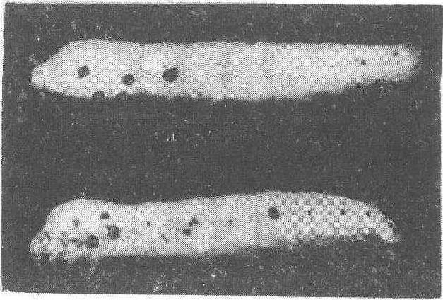 图 2 绿僵病蚕症状 诊断与防治 发现可疑病蚕时,依照本病病症对照可作初步诊断。进一步可取病蚕血液,镜检病原,如察见上述特殊形态的短菌丝,即可确诊。防治措施主要是做好蚕室、蚕具、养蚕环境的消毒,并在此基础上加强蚕体、蚕座消毒,消灭病原,防止接触传染。同时要重视对野外昆虫,包括大田害虫和桑树害虫的驱除,防止交叉传染。注意小蚕期保温,避免低温多湿。具体措施参照白僵病防治方法。 绿僵病秋蚕期常见的一种僵病,由真菌病原绿僵菌引起。因蚕尸上覆盖一层鲜绿色分生孢子,故名。致病过程同白僵病大致相同,但病势较缓慢,特异性病斑特点是在腹侧或背面出现黑褐色不规则轮状,云纹状病斑,病斑外围色深,中间稍淡。蚕儿死亡后,虽尸体也经“软化一硬化”的变化过程。但在此过程中尸体不产生“从尾部出现桃红色”的症状特点。取病蚕血液显微镜镜检,发现“豆荚状的菌丝体”即可作为本病早期诊断的重要依据。 |