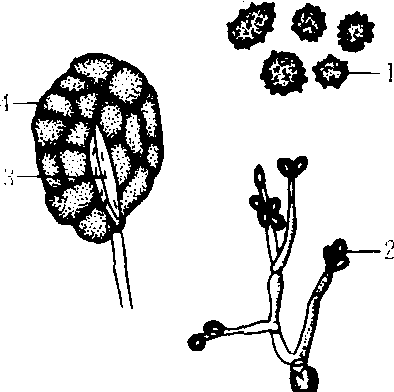 绿核菌属 1.分生孢子 2. 次生小孢子 3. 寄主颖片 4. 分生孢子座 |