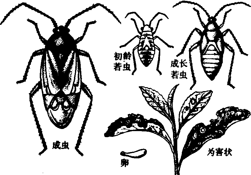 绿盲蝽 生活习性 在长江流域一年发生5代, 以卵在茶芽, 枝桩、冬作豆类和蒿类茎内越冬。翌年4月上、中旬孵化为若虫, 随即刺害一轮茶芽, 至5月中旬发育为成虫飞去, 迁至棉等其它植物上危害, 茶园虫口较少, 成、若虫生活隐蔽, 行动极为活泼, 喜湿, 晴日匿居丛间, 晨、昏和阴天昼间在芽叶上活动危害,刺吸频繁, 少量虫口即可使田间出现大量为害症状,密植多肥茶园更是如此。 防治 主要掌握越冬卵盛孵期, 当茶树出现被害症状时, 及时喷药, 通常可以喷施40%乐果、50%辛硫磷、50%马拉松或50%敌敌畏1000~1500倍液;2.5%溴氰菊酯, 20%杀灭菊酯或10%除虫精6000~8000倍液。 绿盲蝽green mirid bugLygus lucorum Meyer-Dur,昆虫纲,半翅目,盲蝽科。广泛分布于欧亚大陆的温带地区,遍及中国各地。寄主有棉、麻、苜蓿、胡萝卜、杞柳、大豆、玉米、麦、桑、茶、桃、李。成虫体长约5 mm,绿色;前翅基半部绿色,革质,端半部暗灰色,膜质,两个翅室棕黑色。若虫共5龄,末龄若虫体长3.2~3.8 mm,绿色。中国一年发生3~7代,以卵在寄主组织中越冬,南方地区卵和成虫均可越冬。成虫活动敏捷,有趋向现蕾开花期植物的习性。成、若虫刺吸为害棉嫩头、嫩叶等营养器官,造成叶片破烂,俗称“破叶疯”。棉花盛蕾期是主要受害期。在棉花上,卵多产于棉叶柄、叶片边缘和叶脉组织内。在茶叶上,卵多产于茶芽、枝梢、断桩等组织内越冬,成、若虫生活隐藏活跃,春季刺吸一轮茶梢。防治的主要措施是:清除田间杂草;对棉田、茶园外主要寄主上喷药以减少迁入虫源;蚕豆适时打顶;棉田、茶园内适时用药毒杀。