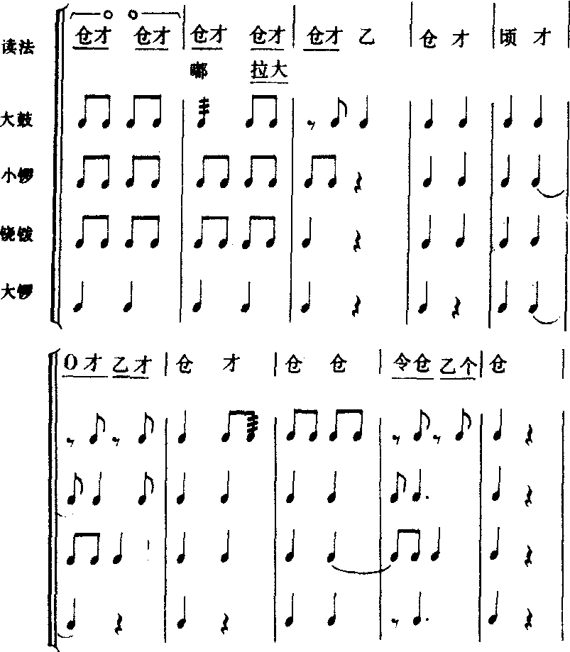 ![]() 为无限反复,当大鼓在第2小节击出嘟——拉大后,即转入第3小节。☓⫻为滚奏)。锣鼓经中常用形声字的敲击法:台,小锣单击;令,小锣轻击;才,铙钹、小锣同击;仓,大锣、小锣、铙钹同击;顷,大锣、小锣、铙钹同轻击;乙个,休止;嘟,鼓双楗滚奏;拉,鼓双楗滚奏后的落音;大,鼓右单楗击;八,鼓单楗击,或双楗同击;冬,大、小堂鼓单击;龙,鼓单楗轻击。学习过程。❶学习各种打击乐器的演奏方法。❷读谱阶段,每人熟悉打击乐谱后,可集体读谱和背谱,使学生了解每件乐器的基本节奏、整体音响效果、每件乐器和整体的关系。 ❸初练阶段,不急于要求表情处理,只要求每个学生能熟练自己的声部并和全体合拍就行了。 ❹熟练阶段,教师说明演奏速度、强弱变化、感情处理,然后排练,比较纯熟后,互相交换乐器学习,可培养多面手,达到更好的学习效果。 |