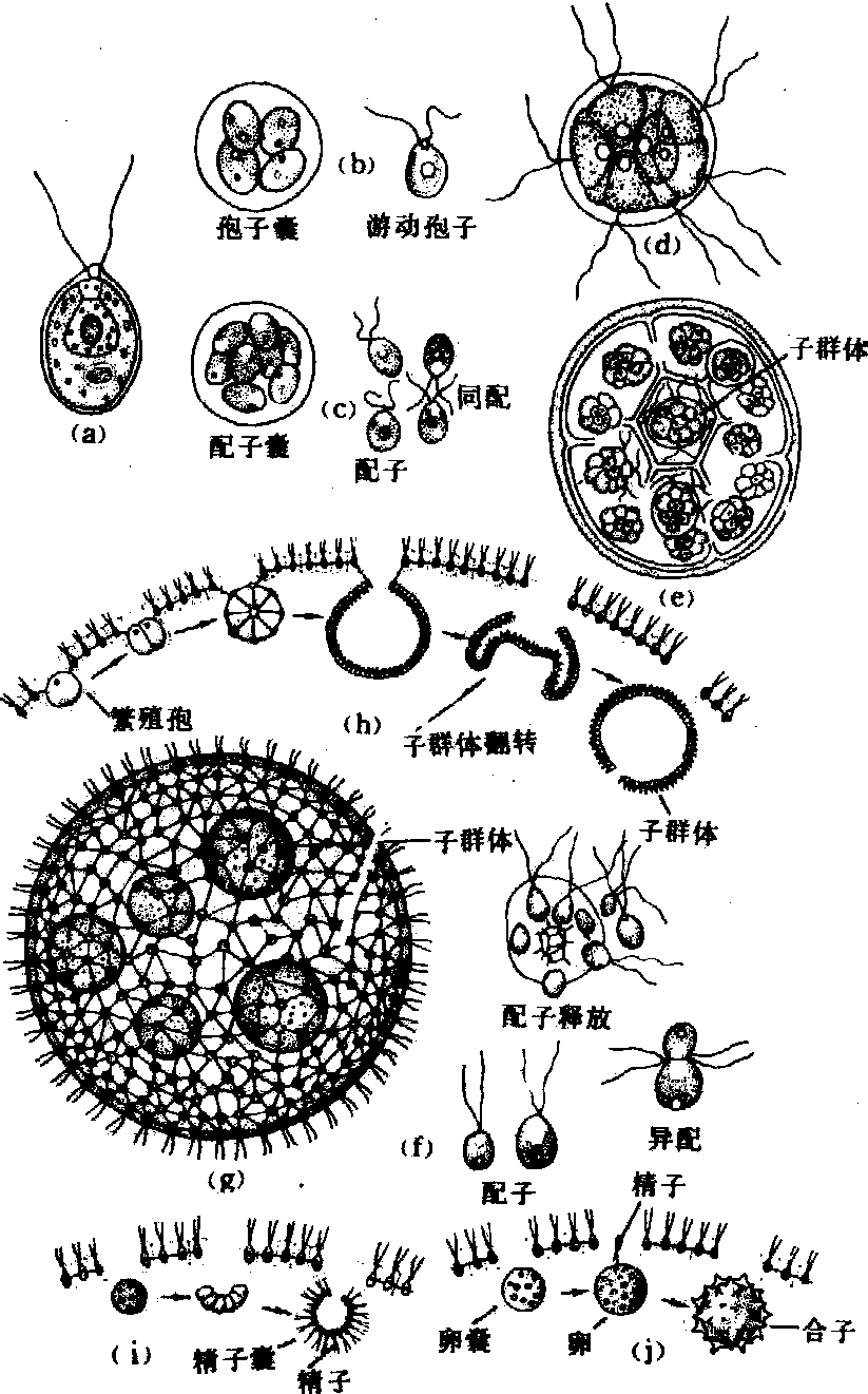 常见的代表属种有:❶衣藻属(Chlamydomonas),单细胞植物,多为卵形,前端有两等长鞭毛,鞭毛基部有两伸缩泡,旁边有一红色眼点。叶绿体呈杯状,其中央基部有一蛋白核。细胞核一个,有线粒体、高尔基体、内质网等细胞器的分化。无性繁殖时产生游动孢子。有性生殖时,多数种类为同配。 ❷实球藻属(Pandorina),为8、16、32个衣藻型细胞组成的球状群体。无性繁殖时群体中细胞同时分裂,各形成一个新群体。有性生殖通常为异配。 ❸团藻属(Volvox),由数百至数万个衣藻型细胞组成一空心球体。空腔内充满胶质和水。藻体中多数细胞为无繁殖能力的营养细胞;少数大型、具繁殖能力的细胞称繁殖胞。各细胞间有原生质丝相连。无性繁殖时由繁殖胞发育成子团藻。一个母体内可含数个子团藻。有时子团藻在母体内已开始繁殖产生第三代。有性生殖为卵式生殖,由少数繁殖胞产生精子囊与卵囊。 ❹小球藻属(Chllorella),无鞭毛、圆形或椭圆形的单细胞体。仅有无性繁殖。 ❺水绵属(Spirogyra),由一列细胞构成的、不分枝的丝状体,细胞内具一至数条螺旋、带状的叶绿体。每个细胞都能分裂,亦可由丝体断裂行营养繁殖。它的有性生殖为接合生殖。 ❻石蒪属(Ulva),大形多细胞片状体。产生孢子时减数分裂,孢子体与配子体外观相似,为同型世代交替。此外,常见的绿藻有绿球藻属 (Chlorococ-cum)、栅藻(Scenedesmus)、盘星藻(Pediastrum)、双星藻 (Zygnema)、新月藻(Closterium)、水网藻属(Hydrodictyon)、丝藻属 (Ulothrix)、刚毛藻属(Cladophora)、浒苔属 (Enteromorpha)、伞藻属(Acetabularia)等(图1、2)。
