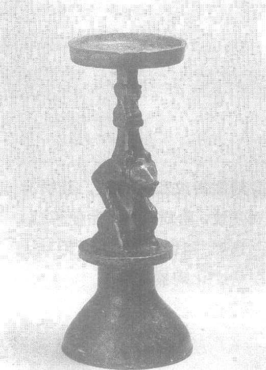 | 释义 | 绿釉陶熊灯汉,高46.5厘米。上海博物馆藏。此灯由盘、柱、座3部分组成,其造形修长而富于变化。灯座似一扣置的高脚碗。灯柱为子母熊形。小熊踡缩于灯柱的上部。母熊被安排在陶灯通高的中心点上,极为醒目。其形象为弯腰弓背,前爪搭于后肢膝部,正在怒目而视,张嘴大吼,神态十分逼真。工匠对熊的面部进行较为写实的创作,熊身体其余部位的表现则使用大刀阔斧的写意手法。创作者所表达的虽是母熊凶悍慑敌的一瞬,但传达出的却是母爱的温情。此陶灯通身施苔藓色的绿釉,为汉代陶器的一个创新品种——铅釉陶。当釉以铅为助溶剂,在800℃低温下即可溶解,使用这种釉料的陶器叫铅釉陶。