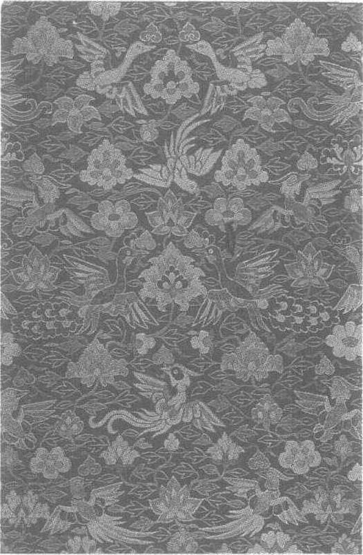| 释义 | 缂丝紫鸾鹊谱图北宋。纵131.6厘米,横55.6厘米。辽宁省博物馆藏。在紫色经丝地上运用掼、结、勾、搭梭、渗和戏等缂丝技法和分区分段挖花缂织。经面以单丝抢缂为主,间以齐缂,缂织细部分用两根经丝,粗则跨越五根。缂织图案每组由五横排花鸟组成,有牡丹、佛莲、折枝荷花、海棠和鸾鹊、鹦鹉、鸂鶒、黄莺、孔雀、鸳鸯、鸠鸟、锦鸡等。诸鸟形态各异,均作展翅飞翔状,其喙衔瑞芝,在花丛中飞舞。整个花纹图案完整,纹样热烈繁茂,是缂丝织品的珍品。