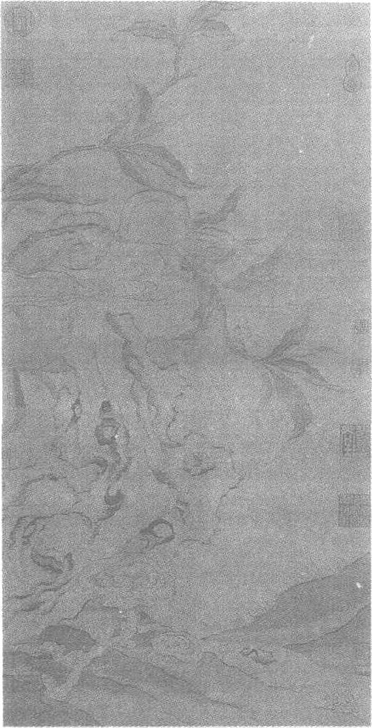 | 释义 | 缂丝蟠桃花卉图南宋。纵71.6厘米,横37.5厘米。辽宁省博物馆藏。五色紵丝织品,运用了勾缂、长短戏、渗和戏等缂丝技法,缂织有桃树、灵芝、寿石、溪泉。桃枝之上祥云萦绕,硕桃与盛开的桃花并生,并略施以彩笔渲染,使之更富有浪漫色彩。蟠桃自古有王母蟠桃之故事,其千年结子,故称“寿桃”;灵芝又称“瑞芝”,在帝王实行仁德之政时生成,有保长寿之功效,又有羽化成仙之传说,所以灵芝被认为是一种非常吉祥的植物;寿石是湖石的雅名;数者画在一处,寓长寿之意。幅下锈钤有: 〈耿氏鉴藏〉,〈乾隆御览之宝〉、〈宜子孙〉、〈石渠宝笈〉等织印款。