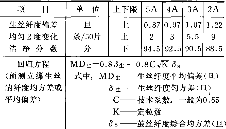 注: 本表数据参考浙江省1982年《桑蚕丝工艺设计办法》 自动缫等级设计 春、夏秋茧都以均匀2度变化为主进行设计,原料茧的解舒丝长与均匀2度变化存在着对应关系,运用二元一次回归方程进行预测、缫制19~21、20~22旦纤度规格生丝,可参照下表数据进行。 自动缫等级设计参数