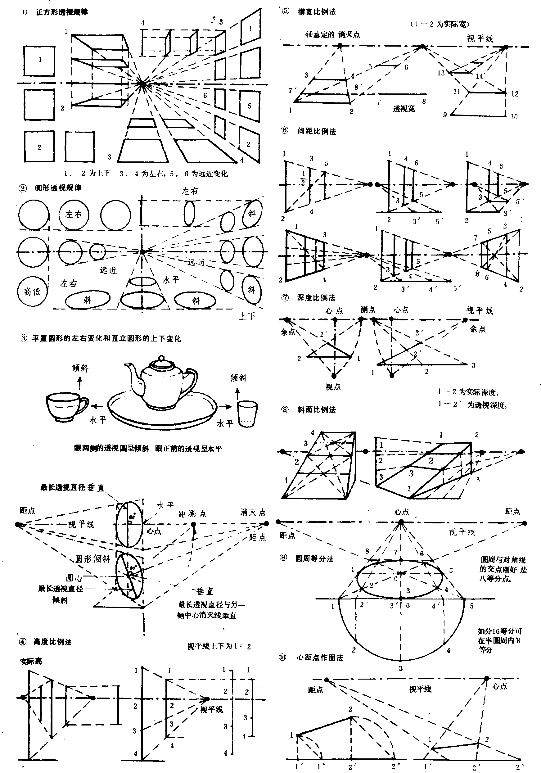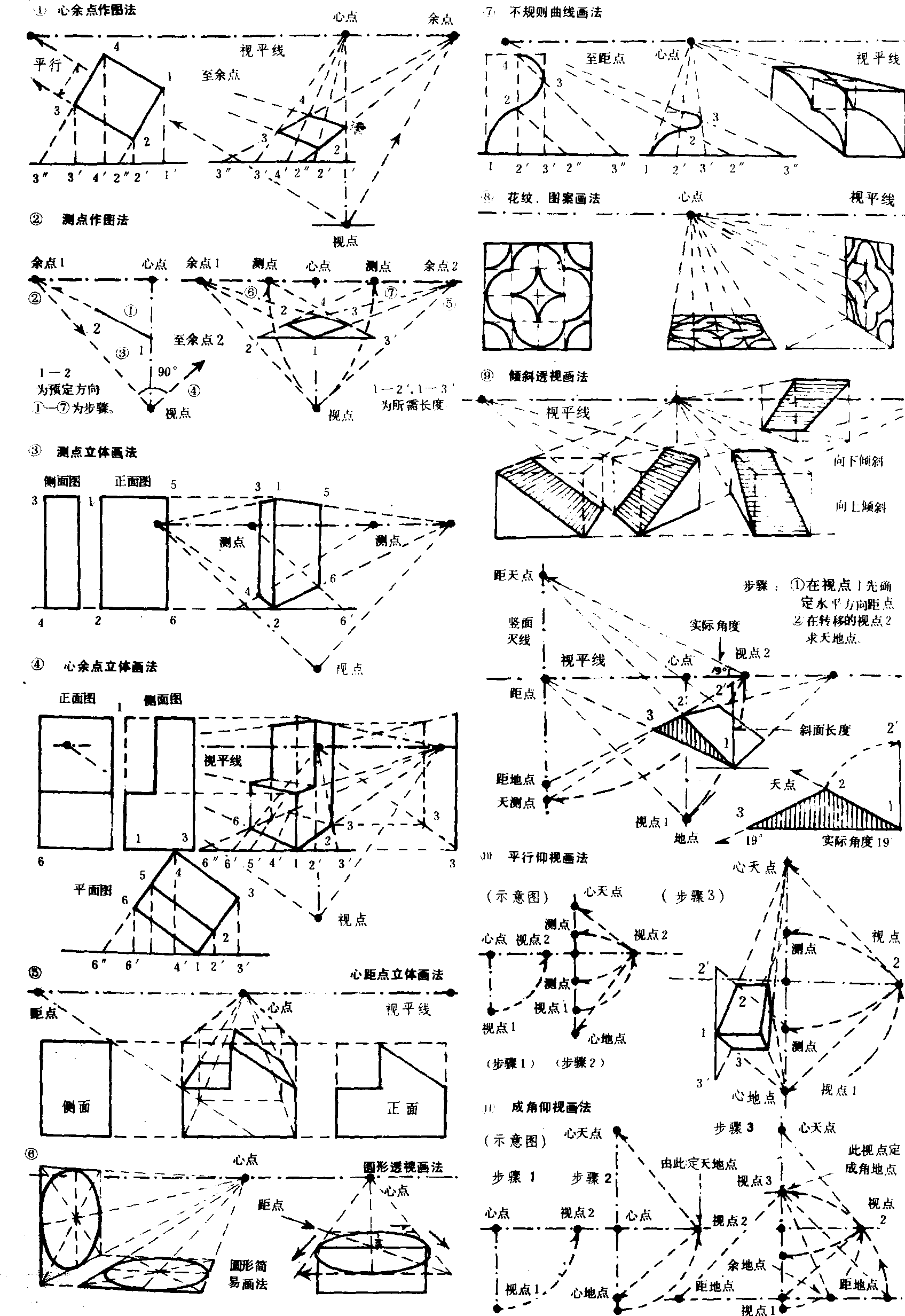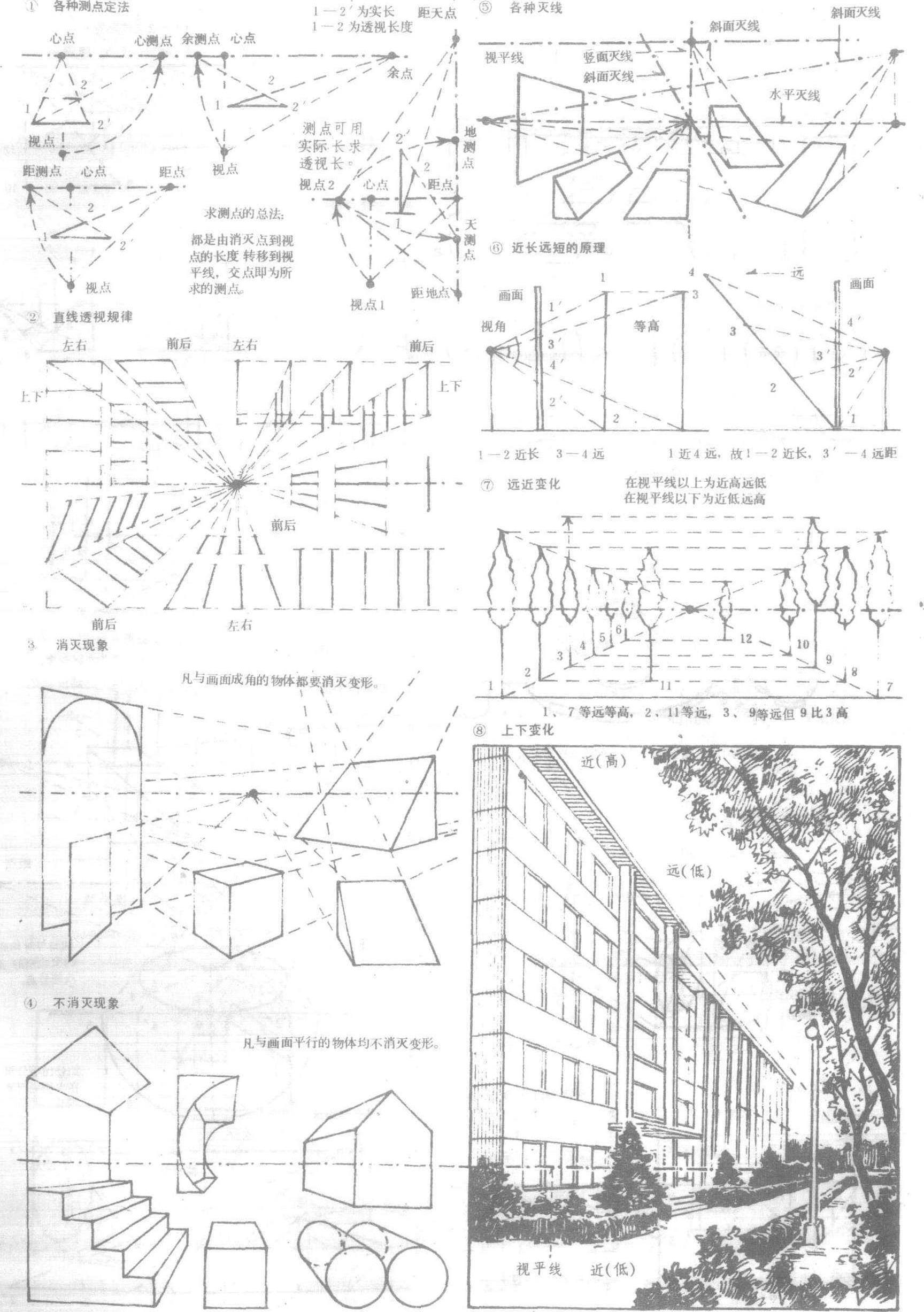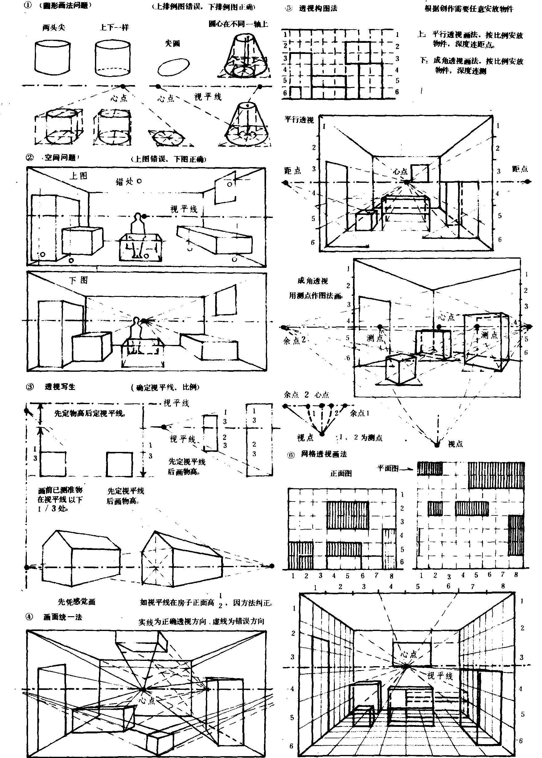 此法是简易实用的作图法。❶先画方格的平面图,把画的物体布置在方格内。作图时先画方格平面图透视,再在透视方格内按方格位置画物体的长、宽、高。❸竖面高度比例要和平面图一致,或先画方格竖面比例图,同样画出透视竖面方格比例图用来确定物体高度(图8❻)。