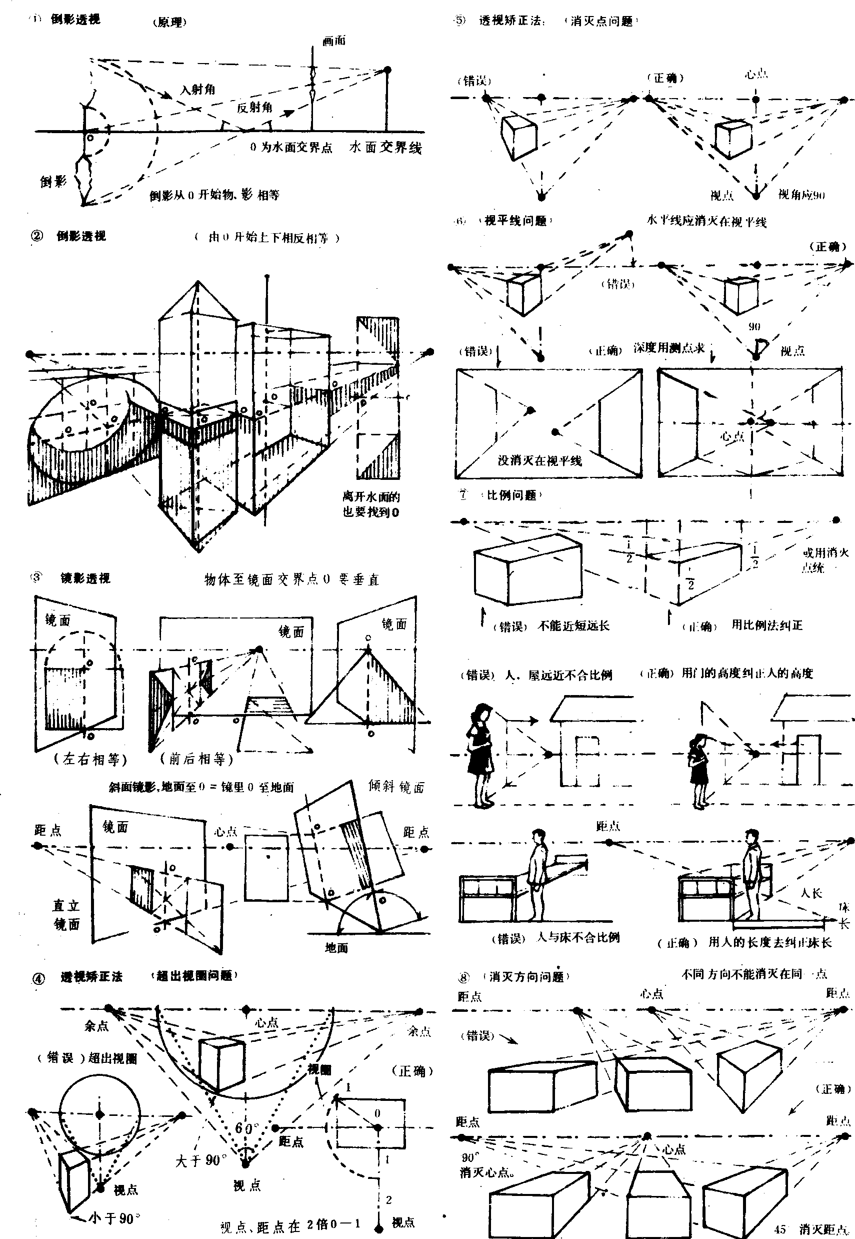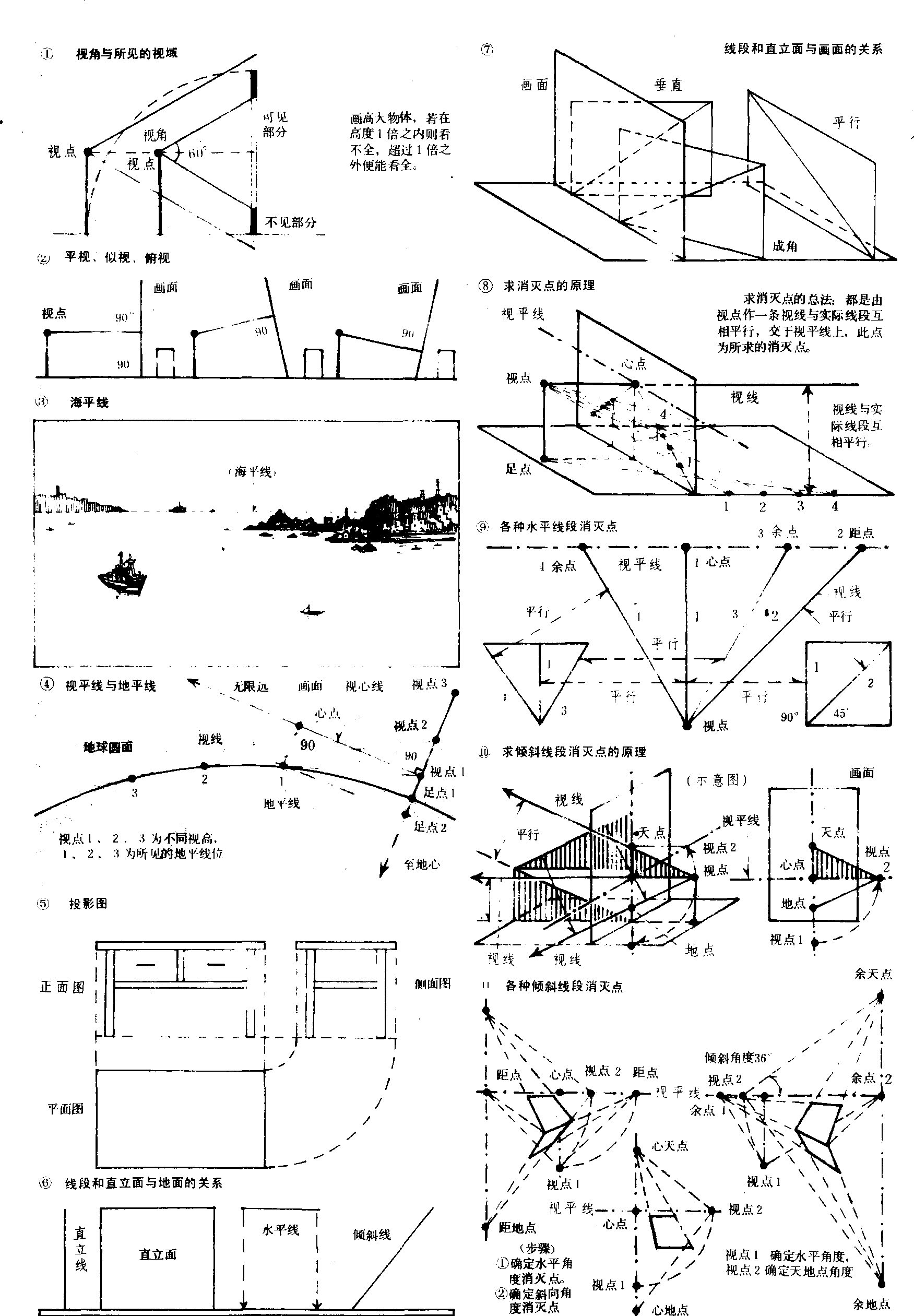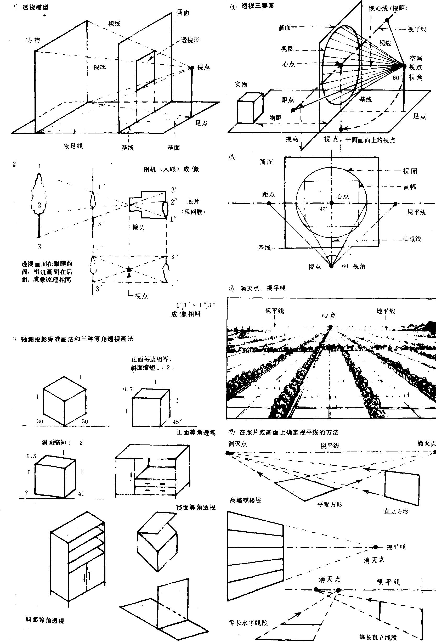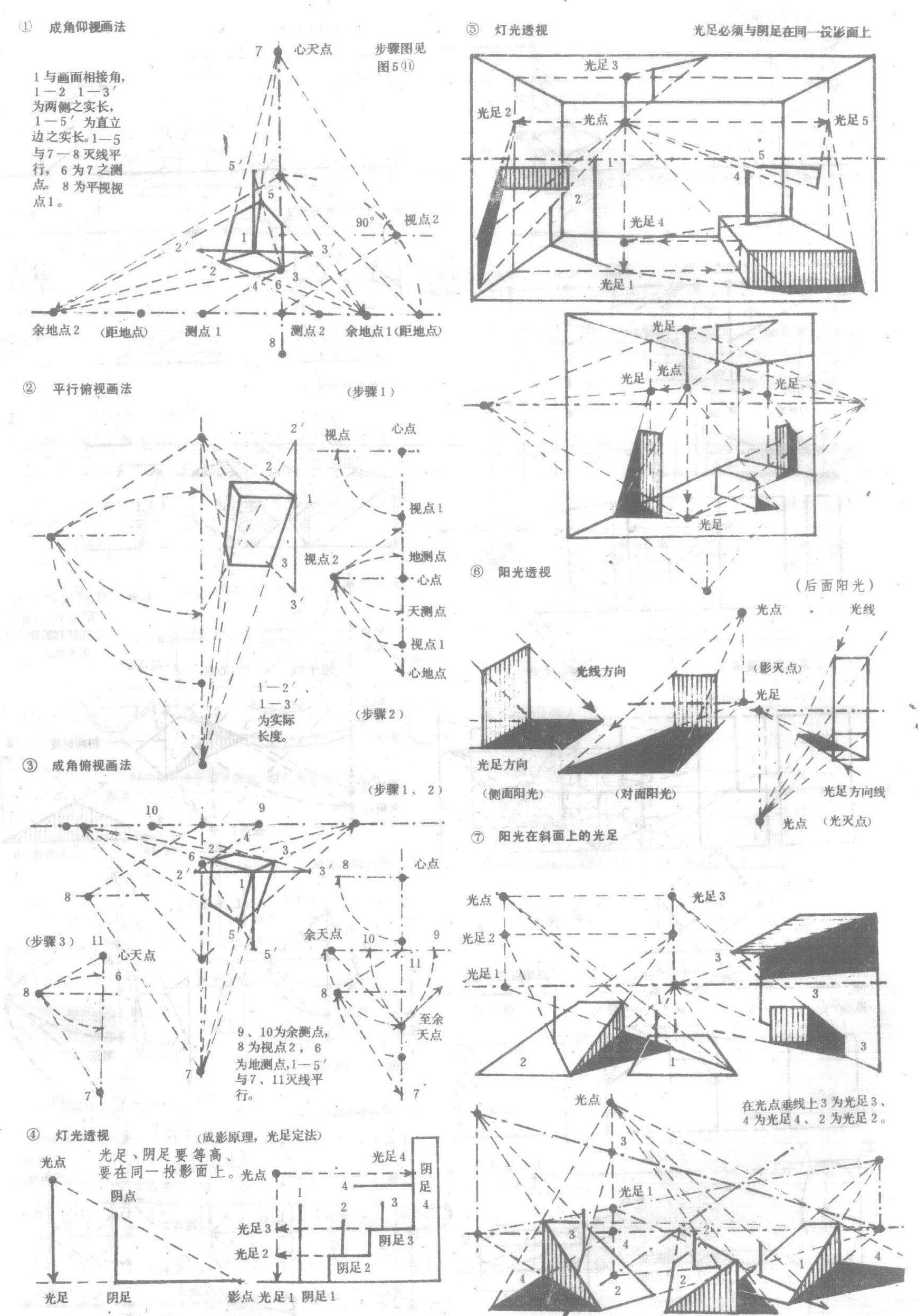 此法是简易实用的作图法。❶先画方格的平面图,把画的物体布置在方格内。作图时先画方格平面图透视,再在透视方格内按方格位置画物体的长、宽、高。❸竖面高度比例要和平面图一致,或先画方格竖面比例图,同样画出透视竖面方格比例图用来确定物体高度(图8❻)。