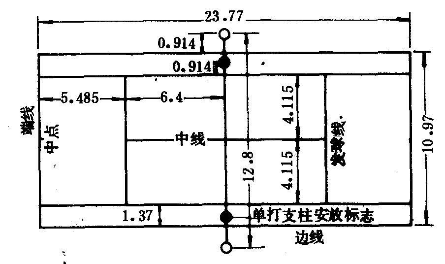 | 释义 | 网球比赛场地与器材网球比赛的场地是一个长方形,长23.77米,宽8.23米。球网中央高91.4厘米,网柱高1.07米,直径不得超过15厘米,把全场隔成相等的两个半场。接近球网两边的4块相等的区域是发球区。双打场地的两边比单打场地每边宽1.37米。当一兼有单打和双打的场地挂着双打球网时,若用于单打,球网须用高度为1.07米的两根支柱支撑,这两根支柱被称“单打支柱”,其直径与边长不得超过7.5厘米,单打支柱中心距单打场地边线外沿0.914米。此外,端线以外至少要有6.40米的空地,边线以外至少要有3.66米的空地。(见图2—3—64)球场地面可概括为3类:草地、沙土地和硬地。草地场的草皮长短一致、疏密均匀,造价高,保养费用大,已日趋减少,温布尔顿锦标赛和澳大利亚公开赛使用的是草地场。沙土地球场修建方便,费用低廉,目前欧洲和我国大都是此种场地,法国公开赛用的就是黄土场地。最初的硬地是用石子、水泥或沥青制成,它不受雨水影响,无需专人保养,东南亚国家和美国南部多为硬地球场。近二十年来,随塑胶工业的发展,在硬地场上涂几层塑料化合物,以增加弹性和保护场地,无需过多保养,它越来越多地代替着其它类型的场地,美国公开赛现用此种场地。球拍为长柄的椭圆形框子。拍框和拍柄的总长不得超过81.28厘米,总宽不得超过31.75厘米。拍框内沿总长不得超过39.37厘米,总宽不得超过29.21厘米。拍框有木制、金属制或石墨制。框子用羊肠线、牛筋线或尼龙线穿织成拍面(见图2—3—65)。球为白色或黄色,外表毛质均匀,无缝线,直径6.35~6.67厘米,重量56.70~58.5克,从2.54米的高处自由落下时,能在混凝土地面上弹起1.35~1.47米(图2—3—65)。