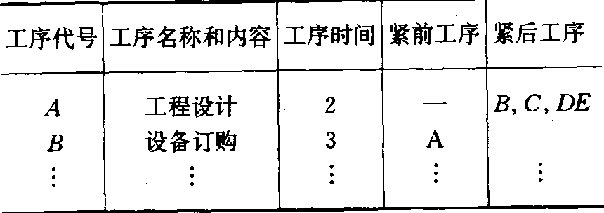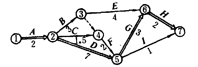 网络图 对不需要人力和物力,只需要时间的过程,如水泥浇灌后的固化时间,也当作一个工序进行安排。❷绘制网络图。以下图为例来说明。图中箭头表示工序。圆圈(顶点)表示事项,事项表示一个工序开始或结束的时刻。圆圈中的数字是事项的编号。工序代号写在箭杆上方,工序时间写在箭杆下方。一支箭杆上的两个事项不能同另一支箭杆上的两个事项完全相同。有时,为表示工序之间的先后关系,需引入虚工序,它不代表任何实际活动。如图中用 ❸→ ❹表示工序E的紧前工序是B,而工序F的紧前工序是B和C。 ❸网络图中的参数计算。参数计算的主要目的是找出工程中的关键工序和关键路线。工序时间是指完成任务所需的时间,用T(i,j)表示。当难以准确确定工序所需时间时,可采用三点估计公式计算:
