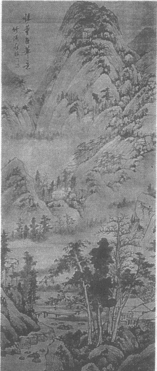 | 释义 | 罗牧山居秋色图轴清。罗牧绘。纸本水墨。纵279.5厘米,横117.5厘米。山东省泰州市博物馆藏。罗牧(公元1623—?年),字饭牛,江西宁都人,寓居南昌。善书画,笔意在董其昌、黄公望之间,而渐创独特风格。其画林壑森秀,墨气滃然,颇具妙韵,为江西派创始人。康熙十六年(公元1707年),85岁时尚在。作者在此图中以有限的篇幅安排了遥深的场面,兼具平远、高远二法。几株山石间生长的乔木为眼前之物,在此望去,屏列的秀峰层叠不绝。山间泉水汇聚成溪,似潺潺有声横跨木桥通向彼岸村落。峰峦重叠,林木繁茂,房舍庙宇掩映其间,再配以云雾烟霞,具有深秀空灵的情致。山石多作长披麻皴,点苔松活,墨色浓淡兼具。树干采用双勾,树叶十分写意,具有苍秀古朴之气。作者笔法流畅沉着,墨气滃然,苍莽雄浑的气势跃然纸上。画左上方题“临董、巨笔意。”款署“竹溪罗牧”。