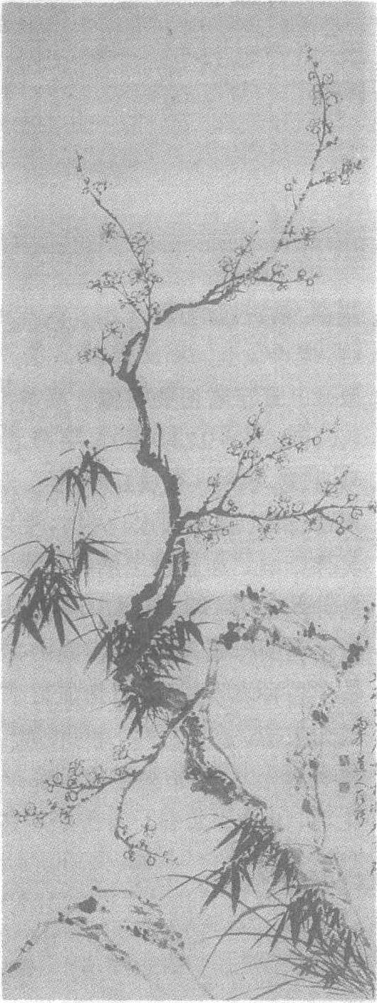 | 释义 | 罗聘梅竹双清图轴清。罗聘(见《罗聘山水花卉册》条目)绘。纸本墨笔。纵166.9厘米,横65.3厘米。辽宁省博物馆藏。此幅写梅、兰、竹三君子。画面右下角几块石头,以淡墨勾写,稍加皴擦,数点焦墨醒于其上。石根处一丛兰草,笔法清健,姿态婀娜。中间一棵梅树昂首峭立,枝干细劲,花朵争相怒放,冷香袭人。二枝细竹从兰草中穿出,墨色浓重,挺秀清脱,刚中有柔,静中寓动。兰草的雅洁飘逸,竹枝的清秀坚韧及梅花的傲然脱俗相映争清。笔法清奇、拙朴、生冷、疏放,似以梅、兰、竹石喻君子之情。罗聘是一位多面手画家,写梅兰竹石自成风格,他“写竹不满十数叶,能使叶叶生长风”,而其“生平所得力,全在梅花枝”。浓淡交映,疏狂粗放。画石如屈铁,刚劲有力。此幅集梅竹兰石于一纸,笔法各异,面目多样,实乃难得之作。款识:“立亭大兄嘱,写于凝香书屋,两峰道人罗聘。”