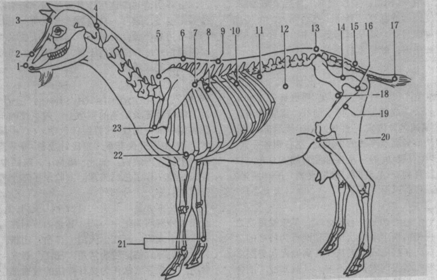 图3 单的骨骼及穴位 羊四肢穴位 共有穴名30个,前肢14个,后肢16个,均为左右肢对称取穴。前肢的膊尖、膊栏、肩井、抢风、肘俞、前缠腕,涌泉、前蹄头和后肢的大胯、小胯、肾堂、掠草、后三里、后缠腕、滴水、后蹄头等穴临证较为常用。其中胸堂、缠腕、涌泉、滴水、蹄头等穴一般为血针穴;抢风、三阳络和后三里等穴常为针麻手术所采用。 |