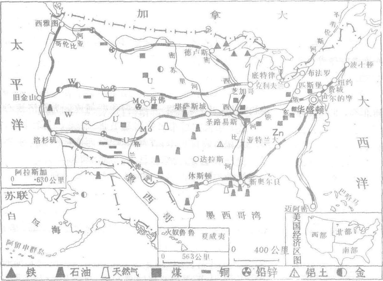 美国农业分区图 美国各国手册丛书复旦大学国际政治系资本主义国家政治教研室编,上海辞书出版社1981年出版。32开,313页。 美国The United States of America“美利坚合众国”的简称。位于北美洲南部,东濒大西洋,西滨太平洋,北接加拿大,南界墨西哥及墨西哥湾。面积9363123平方公里。由50个州和一个特区(首都所在的哥伦比亚特区)组成。首都华盛顿。人口24690万(1989年),多数为欧洲移民后裔。少数民族以黑人为多,其次是墨西哥人、波多黎各人、华人等。居民一半以上信基督教新教或天主教。英语为国语。西部纵列着高峻的数条平行山脉,其间分布着内陆高原和盆地,气候多样,富煤、铁、铜、钼、铅、锌、铀及石油等矿藏。中部为辽阔的平原,由西部的高平原和密西西比河冲积的中央低平原组成。密西西比河有运河与五大湖相通,构成巨大的内河航运系统。平原北为温带大陆性气候,南为亚热带气候,是美国最主要的农业区,并富藏铁矿和石油。东部为较低的阿巴拉契亚山脉和大西洋沿岸平原,降水较多,河流短小,富水力和煤炭资源。1775年前为英国在大西洋沿岸建立的13个殖民地。1776年脱离英国,成立美利坚合众国。此后领土逐步扩张到太平洋沿岸,并向海外争夺殖民地,吞并了阿拉斯加和夏威夷群岛。世界上经济最发达的资本主义国家。工农业生产和对外贸易都居世界首位。工业部门繁多,以汽车、飞机、宇航、电子、机器制造、冶金、化学为主。军事工业生占很大比重。工业主要分布于北部,二次大战后南部和西部工业发展较快。农业现代化水平和劳动生产率都很高,小麦、玉米、大豆、棉花等产量和出口量均居世界前列,是世界上最大的农产品出口国。交通发达,公路和铁路的长度均居世界首位,并和航空、海运结合,形成庞大的综合运输网。输出以各种机器、化学品、汽车、飞机、农产品等为主,输入石油、矿产品、服装和热带农产品等。 美国美国面积936.3万平方公里。人口23940万。其中白人占80%以上,黑人占1 1.6%,华人约80万。通用英语。居民主要信奉基督教新教,其次为天主教、犹太教、东亚教。首都是华盛顿。位于北美洲大陆。北与加拿大交界,南接墨西哥和墨西哥湾,东濒大西洋,西临太平洋。海岸线长22,680公里。地势东西高中间低,无东西走向山脉。大致可分为大西洋沿岸平原、阿巴拉契亚山脉、内地平原、西部山系、西部山间高原等五个地理区。大西洋沿岸平原是北美东部沿海平源的主要部分,北起新英格兰,南达墨西哥的尤卡坦半岛,向西包括佛罗里达半岛。阿巴拉契亚山脉绵亘2400公里。内地平原北起美加边界,南达大西洋沿岸平原的格兰德河一带。西部山间高原地区主要组成部分是含有大盐湖的大盆地,地貌复杂多样。西部山系有北美山系的落基山脉和内华达山脉,最高点为内华达山区的惠特尼峰,海拔4418米。该峰附近的死谷的最低处低于海平面85米,为北美最低点。落基山脉为太平洋水系和大西洋水系的分水岭。太平洋水系主要有: 科罗拉多河、哥伦比亚河、育空河。大西洋水系主要有: 密西西比河(全长6415公里)、康涅狄格河、赫德森河。东北部的苏必利尔湖 (面积为82400平方公里,为世界最大淡水湖)、休伦湖、密执安湖、伊利湖和安大略湖等五大湖是世界上最大的淡水湖群。属于温带和亚热带范围,仅佛罗里达半岛南端属于热带。大部分地区属大陆性气候,南部属亚热带气候。气温因季节而不同。中北部平原温差较大,芝加哥1月平均气温—3℃,7月24℃。墨西哥湾沿岸1月平均气温11℃,7月28℃。全国降水量极不平均,从250毫米至4000毫米,夏威夷群岛个别地区高达12000毫米,为世界上最多雨地区之 美国北美洲国家。全称美利坚合众国。1776年7月4日建国。有50个州,其中阿拉斯加州位于北美洲西北部,夏威夷州位于中太平洋北部。海岸线长22680km。国土总面积9372614km2,居世界第4位。人口2.71亿(1998),居世界第3位。其中白人约占84%,黑人约13%,华人约164.5万。首都华盛顿在哥伦比亚特区。1979年1月1日与中国建交。美国本土地势东西两侧高、中间低,明显分为3个纵列带。内华达山脉中的惠特尼山海拔4418m,为本土最高海拔。内华达山脉东侧低于海平面86m的死谷,是北美洲陆地的最低点。密西西比河长6262km,为世界第4长河。苏必利尔湖为世界最大的淡水湖(面积82400km2)。美国本土基本上介于30°~49°N之间。除山地外,38°N以北地区,1月平均气温一般低于0℃,以南地区高于0℃;7月平均气温除西海岸和山地以及五大湖北部地区外,一般都在20℃以上,西南部科罗拉多河下游一带,在30℃以上。年均降水量一般在500mm左右,科罗拉多河下游地区,年均降水量不足90mm;西北部沿海和东部沿海地区,年均降水量在1000mm以上。1998年国内生产总值85107亿美元,人均国内生产总值31521美元。1998年国内生产总值增长率3.9%,1998年通货膨胀率1.6%。至1998年第3季度,非农业生产部门创造的国内生产总值为71263亿美元,工业生产率为1992年的158.1%。1997年非农业部门就业人数为:制造业1853.8万,矿业57.3万,建筑业562.7万。1998年非农业产品出口额达6281亿美元。1996年部分工业产品产量:原油23.94亿桶、煤10.33亿t、发电量29950亿kW·h、钢1.05亿t、铜190万t、铁矿6100万t、金320t、银1800t、铝7.4万t(1994)、锌62万t。农业生产总值约占国民生产总值的1%。1994年农、林、渔业部门就业人数194万。1996年全国有