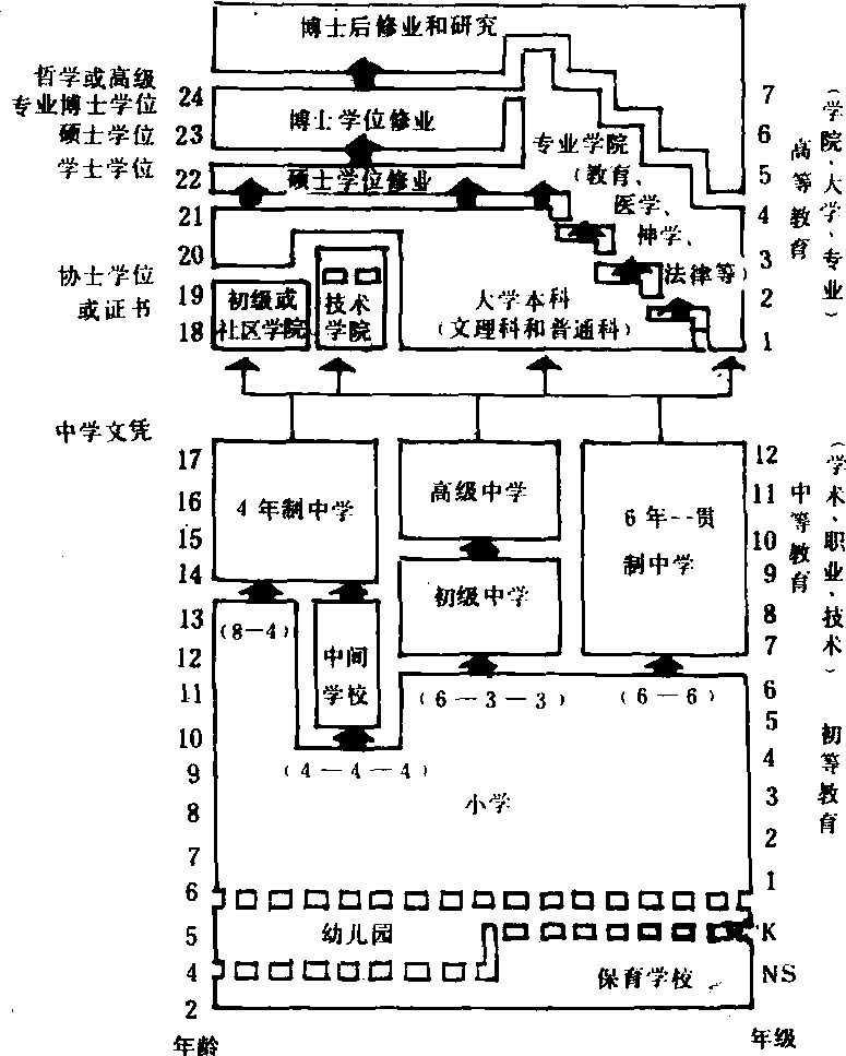 | 释义 | 美国学制Meiguo xuezhi美国各级各类学校系统。美国学制本世纪初已基本定型,现行的美国学制由学前教育、初等教育、中等教育和高等教育四个阶段构成。由于历史的原因以及美国采取地方分权制,美国学制有多种形式并存的现象(如图)。除了“6·3·3”制(小学6年,初中3年,高中3年)为主以外,还有“6·6”制、“4·4·4”制、“5·3·4”制和“8·4”制等。美国的学前教育通常为3年,主要在保育学校和幼儿园进行。小学和中学一共12年,义务教育从小学开始,但各州不统一,多数州为9年,少数州为8年、10年、11年或12年。4年制或5年制小学毕业的学生通常升入4年制或3年制的中间学校。美国高等教育以4年制大学为主,但也有2—3年的技术学院和初级学院(或社区学院)。美国研究生教育1—5年。中小学师资由文理学院、综合大学和师范学院培养,这些大学均有教育学院或教育系。美国学制除具有鲜明的单轨制特点外,由于它的各级各类学校兼施成人教育,因此具有正规教育和非正常教育相结合的特点;又因其综合中学兼施职业技术教育,因此还具有普通教育与职业技术教育相结合的特点。