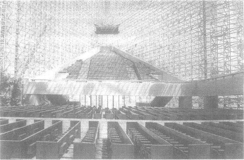 | 释义 | 美国登格罗夫水晶教堂建于1980年,平面为方形,以覆盖镜面玻璃的空间钢网架形成变化的几何形体,钢网架内的教堂大厅呈梭形布置,直对入口的梭形一角的布道台与二侧角部的观众席为阶梯形,与中部的观众席形成三角高、中部低的向心型空间,使十分简单的方形平面产生丰富的空间变化,教堂四壁仅以简单重复的白色三角形钢网架交织而成,但是大的体型变化,给人以终生难忘的空间感受,天光通过玻璃网架射入室内,光影婆娑,如同置身于光与影的水面,充满了 一种纯净而欢乐的气氛。