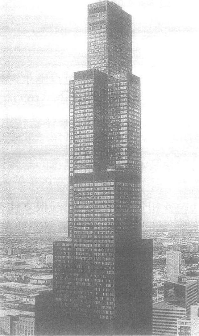 | 释义 | 美国纽约西尔斯大厦已建成的世界最高的建筑,建成于1974年。高443m,地上共110层,地下三层,总面积为41.8万m2,由9个边长22.9m的正方形组成一个大正方形平面,采取分段收缩的方式,在51层以上切去二个对角的正方形,67层以上再切去另外二个对角的正方形,91层开始仅有二个正方形到顶,突破了通常高层建筑因结构抗震和抗风的要求所带来的体型呆板对称,缺少变化的缺陷,9个方形筒体集束在一起,形成了新的筒体结构的体系。大厦安装了182部电梯,分段设置,在33层和66层有换乘的门厅,如多个高层叠合在一起。大厦由美国著名的设计公司SOM设计。其作品遍及40多个国家,具有优美平实,易于被人接受的建筑风格。