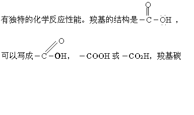 由羰基和羟基结合成的基团称为羧基—COOH。化合物含此功能基团的称为羧酸。羧酸是弱酸,由于羰基和羟基的相互作用,导致羧基具