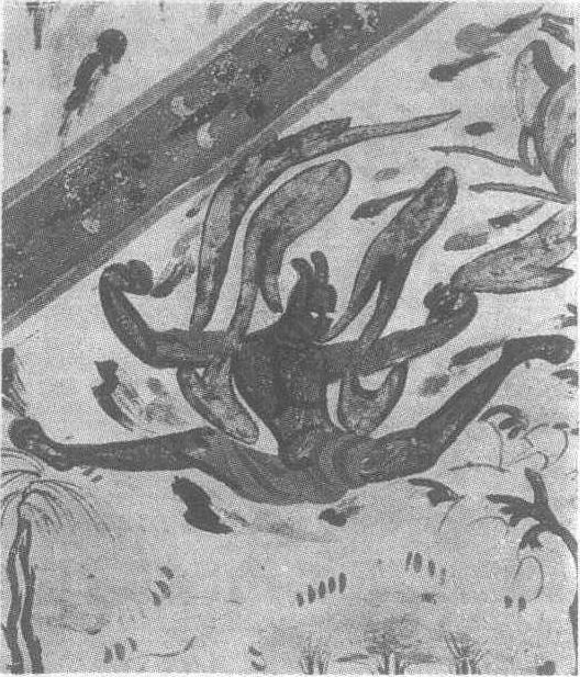 | 释义 | 羽人升腾图壁画西魏。甘肃省敦煌县莫高窟第249窟窟顶北披壁画。《楚辞·远游》:“仍羽人于丹丘兮,留不死之旧乡。”王逸注:“人得到身生毛羽。”洪兴祖补注: “羽人,飞仙也”。《太平御览》卷六六二引《天仙品》云:“飞行云中,神化转举,以为天仙,亦云飞仙”。因此,羽人是千岁不死,羽化升天的神仙。图中羽人双耳高竖,臂生羽毛,上身仅披一巾,飘带翻卷,下着短裙不过膝,四肢向两侧伸开,作升腾状,确有仙人之气。