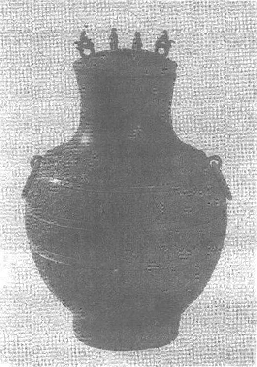| 释义 | 羽翅纹铜壶春秋。高47.5厘米,口径15厘米,底径17.2厘米。重8.25公斤。上海博物馆藏。此壶成对。盖上有四兽形立环,倒置可作盘。肩两侧有兽面衔环的铺首。通体饰五道重叠的羽翅纹。整个的图案是无数个相同的、微小的单位构图的重复,这个小单位是上下两条交错的龙纹,龙体上有许多旋转状的小羽翅。这种极为精细富丽的纹饰,在春秋晚期和战国早期之际非常风行,也是当时的风尚。因为这时已普遍采用了印模法铸作陶范技术,并使这一高超的技术达到了很高的水平。