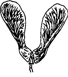 图45 槭的翅果 翅果samara果皮的一部分向外扩延成翼翅的一种不裂干果。由单雌蕊或复雌蕊的上位子房形成,有单翼翅果(如臭椿)、双翼翅果(如槭树)和环翼翅果(如榆树)之分。 |