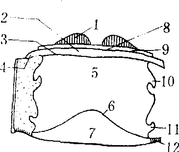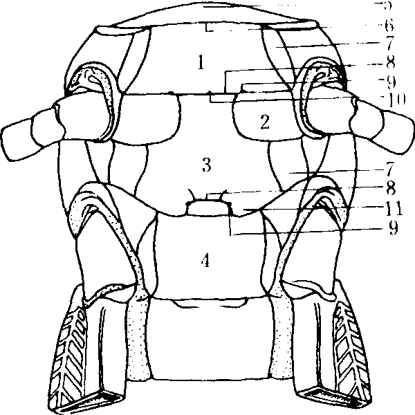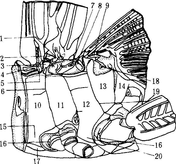 图2 东亚飞蝗翅胸侧板 1. 中胸后上侧片;2.前翅第二腋片; 3.前侧翅突; 4. 中胸第一前上侧片; 5. 中胸第二前上侧片;6. 中胸侧沟;7.后胸第一前上侧片;8. 后胸第二前上侧片; 9. 后翅第二腋片; 10. 中胸前侧片; 11. 中胸后侧片; 12. 后胸前侧片;13.后胸后侧片; 14.后背板; 15. 中胸基前桥;16. 基外片; 17. 侧腹片; 18. 后胸后上侧片; 19. 后胸侧沟; 20. 后胸基前桥 (仿陆近仁、虞佩玉) 腹板 亦属后生分节,但为后节套前节,适与背板相反。后生节的节间膜将腹板划分为膜前的间腹片和膜后的主腹片。间腹片包括前脊沟以前的端腹片和沟后至膜质带之间较小的狭骨片,前移至前一节成为该节腹板后面的一个部分。间腹片较小,前内脊常退化成为一刺状突起,通常称内刺突,因此,间腹片又称具刺腹片。中胸间腹片常与主腹片合并,后胸间腹片受到抑制或是形成第一腹节的端腹片。主腹片上有一条横沟,称腹脊沟,将主腹片划分为前面的基腹片和后面的小腹片。腹脊沟内陷成腹内脊,两侧突起形成腹内突。腹内突常为叉状,故又称叉突(见内骨骼图2)。基腹片的前面还有一条后生沟,称前腹沟,沟前的狭片称前腹片。翅胸节的腹纵肌大部移至叉突上,小部分着生在内刺突上。在基腹片的两侧与前侧片之间常具有侧腹片(pleurosternite)(图3)。