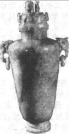 耳双环带盖瓶 清代。通高23.9、腹径9.3厘米。广肩,腹下敛收呈高台小圈足。盖顶雕一狮纽,其下雕四只对称的小羊,肩两侧各镂雕一兽首衔活环耳。雕工精细,造型别致新颖。狮与事谐音,羊与祥通假,瓶与平同音,合在一起,寓意事事吉祥平安。现藏旅顺博物馆。