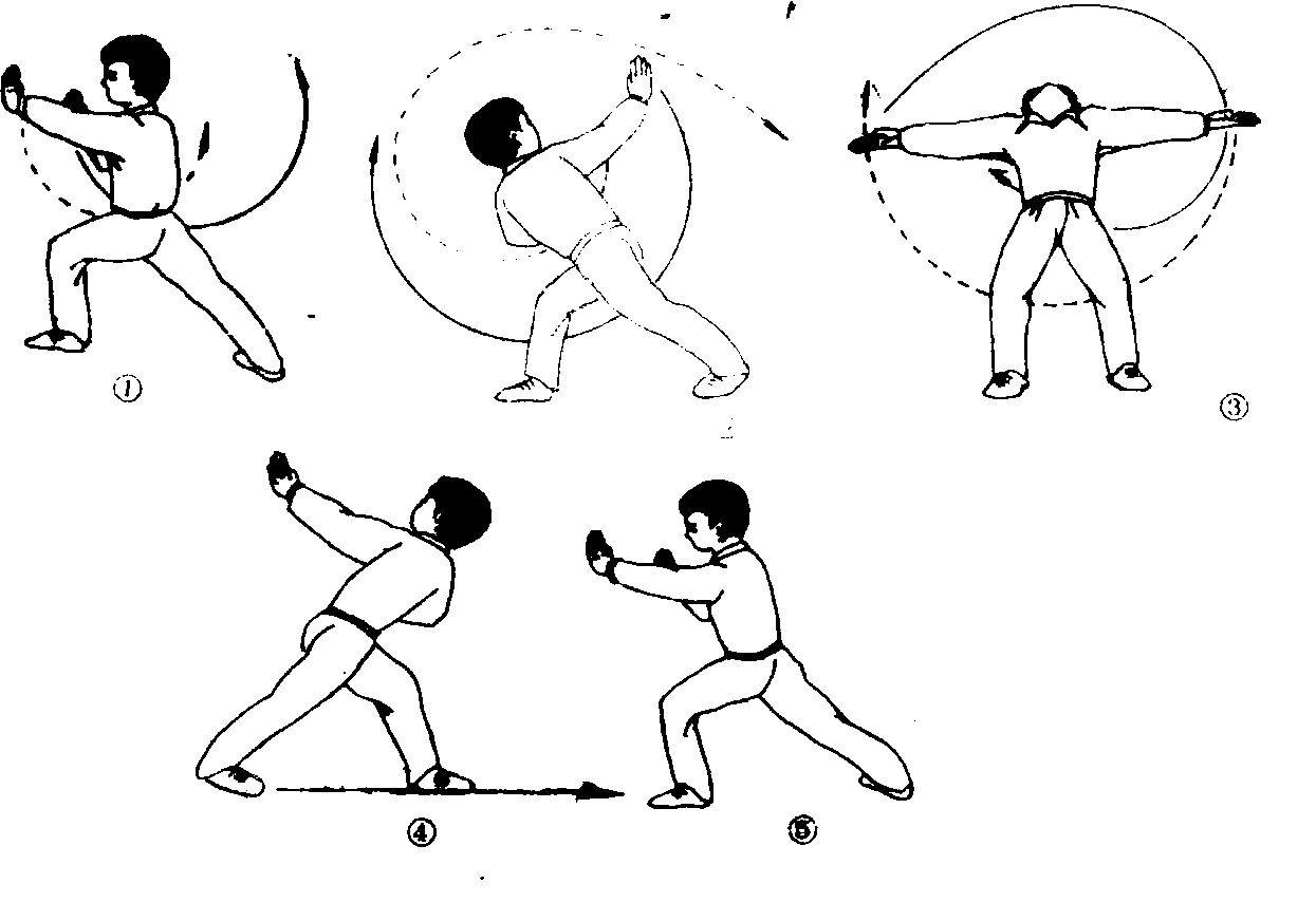 基本动作之一。是在步法配合下,上体以腰为轴的翻转动作。❶弓步双摆掌(预备式);❷左插步双摆掌;❸翻转;❹右叉步双摆掌;❺上步成弓步双摆掌。再依次反复练习。教学重点 强调:❶插步双摆掌时,腰髋要拧紧,两臂要以肩为轴放松摆动,摆幅要大。❷翻转时要挺胸、抬头、挺髋,两臂随身体翻转,要沿立圆路线抡摆。