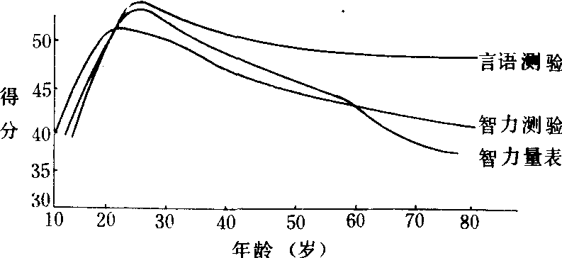 图4—36 晶体和液体智力的年龄变化示意图 〔引自霍恩(Horn),1970〕 从总体上说,智力随年龄的增长而有所减退,但仅限于非语言性的、要求一定速度的动作性智力操作,多限于“液体智力”;而言语性智力、“晶体智力”非但不减,甚至会提高。因此,不能笼统地断言“老年者智必衰”,而应该提倡“老有所学”、“老有所为”,这才是科学的态度。 |