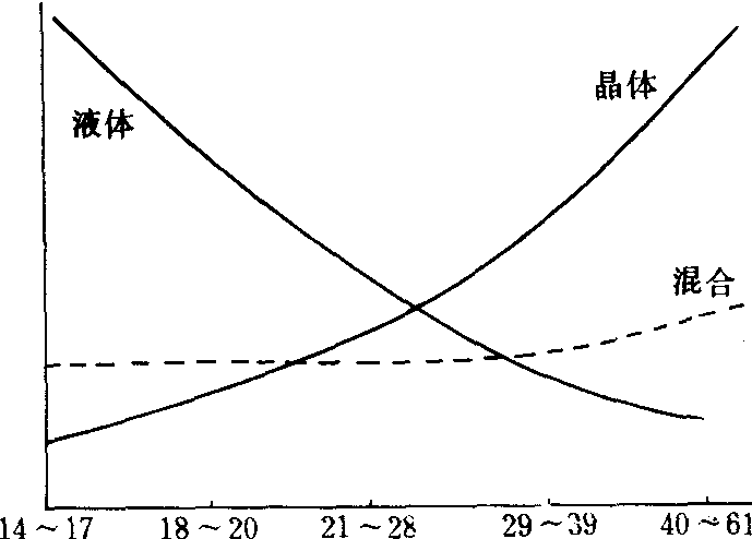 图4-35 智力的年龄变化曲线 老年人的智力并非全部减退 从智力的定义或内涵可知,智力是综合的心理特征,由很多因素构成。不少学者采用纵向研究法认为,从智力发展角度看,智力即使到50~60岁也是稳定的,测验成绩并不下降;也有的认为随年龄增长,知识经验不断积累,创造性思维能力非但不下降,反而不断提高,智力不但不减,还会上升;还有人对智商相同的老年人和青年人进行了比较,发现在知识、理解、单词等言语性测验中,老年人比青年人强;但在书写、搭积木等限速的动作测验中,老年人的成绩不如青年人。后来有人把智力归纳成两类,即“晶体智力”和“液体智力”,前者指与文化、知识经验的积累等有关的后天获得的能力,如知识的广度、词汇的多少、判断力及理解力的高低等;后者是指与神经的生理功能有关、而与知识文化背景关系较小的能力,如近事记忆力、思维的敏捷度、注意力、反应速度及知觉的整合能力等。“晶体智力”随年龄的增长而提高,但“液体智力”随年龄的增长而减退,而“混合”曲线与年龄的增长几乎无关(图4—36)。