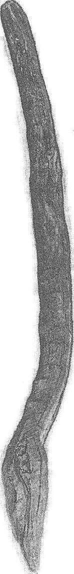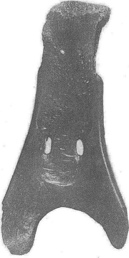 | 释义 | 060 耒耜中国在夏商西周时代使用的耕具是耒耜。“耒”是由原始农业时期使用的尖头木棒发展而来的,在甲骨文中作“ 耒耜ancient spade-shaped tool used fortilling最早的挖土工具。耒耜是两种农具。耒的下端是尖锥式,耜的下端为平叶式。耒是从采集经济时期挖掘植物的尖木棍发展而来的,早期的耒就是一根尖木棍(见图1),以后在下端安一横木便于脚踏,入土容易。再后单尖演变为双尖,称为双齿耒。单尖木耒的刃部发展成为扁平的板状刃,就成为木耜。它的挖土功效比耒大,但制作也比耒复杂,需要用石斧将整段木材劈削成圆棍形的柄和板状的刃,即所谓神农“破木为耜”、“斫木为耜”。早期的耒耜都是木质的,因此不易保存下来。但在河南陕县庙底沟和陕西临潼姜寨等新石器时代遗址中都发现过使用双齿耒挖土后留下的痕迹,在浙江余姚河姆渡新石器时代遗址出土过木耜(见图2)。由于木耜的刃部容易磨损,后来就改用动物的肩胛骨或石头制作,耜刃绑在木柄上成为复合工具,就成为骨耜(见图3)和石耜(见图4)。它们都比木耜更坚固耐磨,从而提高了挖土的功效。目前在北方较早的新石器时代遗址,如河北武安的磁山遗址和河南新郑裴李岗遗址以及辽宁、内蒙古等地的遗址都出土很多石耜,其时代最早可达8000年前。由此推测,木质的耒耜的起始年代当更为久远。目前发现骨耜最多的地方是浙江余姚河姆渡遗址和桐乡罗家角遗址,距今7000年左右。骨耜是用偶蹄类哺乳动物肩胛骨制成。肩部挖一方孔,可以穿过绳子绑住木柄。骨耜的中部磨有一道凹槽以容木柄,在槽的两边又开了两个孔,穿绳正好绑住木柄末端,使木柄不易脱落,其制作方法已相当进步。这种骨耜在南方水田中使用,功效是很高的。 图1 新疆孔雀河出土木耒