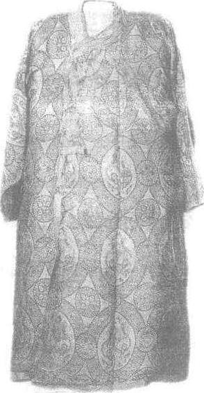 联珠双鹫纹锦袍 出土时,锦袍穿在 一干尸身上,干尸长约190厘米,远高于当时的一般汉人,内衣右胁有孔洞和血迹,当系阵亡的西北民族武将。袍面图案明显有别于同期的汉地丝绸风格,而与当时的西亚艺术息息相通。与此件锦袍 一同在墓中出土的还有不少丝织物,一些明显呈西方样式,另一些又有浓郁的中国风格。此袍袍面则以西方样式为主,中西合璧,如花树、双鹫源出西方,大联珠圈上的龟背纹则来自中国。 |