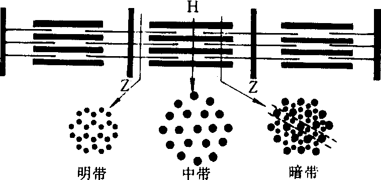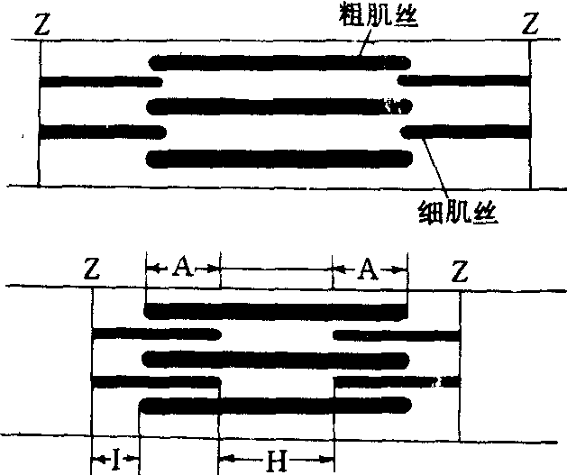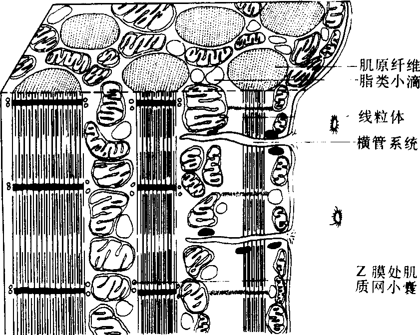肌纤维是长形多核细胞,绝大多数肌纤维外包有一层肌膜,肌膜内含很多平行的肌原纤维,含糖元和脂肪的肌质充塞其间。细胞核的位置与排列随肌肉种类而异,肌原纤维分化程度也有差异。在光学显微镜下观察,每条肌原纤维由众多的明带(I带)和暗带(A带)交替排列组成,呈明、暗相间的分段图象,故称横纹肌。明带内只有细肌丝,折光系数低,色浅; 暗带内有粗、细两种肌丝,折光系数高,发暗。在明带中部横贯一薄膜,使肌原纤维连接于肌膜上,这层薄膜称作端膜(或称Z带),介于两端膜间的肌肉段称为一个肌节。在暗带的中央有一段颜色较浅的中带(H带),电镜下可见中带有一组直径16~21微米的圆点,为肌球蛋白丝(粗肌丝),两端部有粗细不同的两组圆点,粗点为肌球蛋白丝,细点为直径6微米的肌动蛋白丝(细肌丝),细肌丝分布于粗肌丝之间,两种肌丝排列成六角形或三角形(图2)。明带只观察到有细肌丝。超薄纵切片可见到肌膜在肌节中心处横向内陷形成的横管系统(T系统)。肌质内沿肌纤维长轴排列的肌质网,称纵管系统。横管系统和纵管系统组成肌肉的内膜系统,内膜系统与肌肉收缩时的物质交换有关(图3)。x射线衍射显示,暗带肌球蛋白丝表面可发出侧支亦称横桥(图4)。当肌纤维松弛时,横桥与肌动蛋白丝分离,收缩时横桥与肌动蛋白丝相连接,形成肌动球蛋白。肌纤维上气管分布的密度与肌纤维所需代谢强度有关,用于高速飞行的肌纤维气管密度较大。较细的肌纤维上微气管一般分布在肌膜表面;较粗的肌纤维上,微气管插入肌膜以提高供氧量。