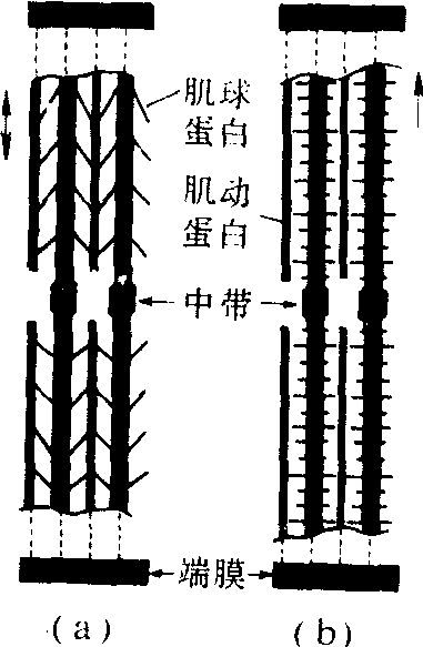 肌肉收缩 肌肉的收缩是两组肌丝间的滑行造成的。在一个肌节内,粗细两种肌丝依肌原纤维长轴相间隔平行排列,细肌丝一端固于Z带上,另一端伸向A带的H区,因Z带与肌膜相连,当肌肉伸缩时,可维持肌原纤维内肌丝的排列,并限制肌丝滑行在两条Z带之间进行(图5)。肌肉收缩时细肌丝的游离端沿粗肌丝长轴向H区滑行,两组肌丝相互靠拢,肌节缩短变粗。细肌丝沿粗肌丝滑行,是由粗肌丝发出的横桥与细肌丝接触引起的。肌肉松弛时,横桥背离H区,不与细肌丝相连。